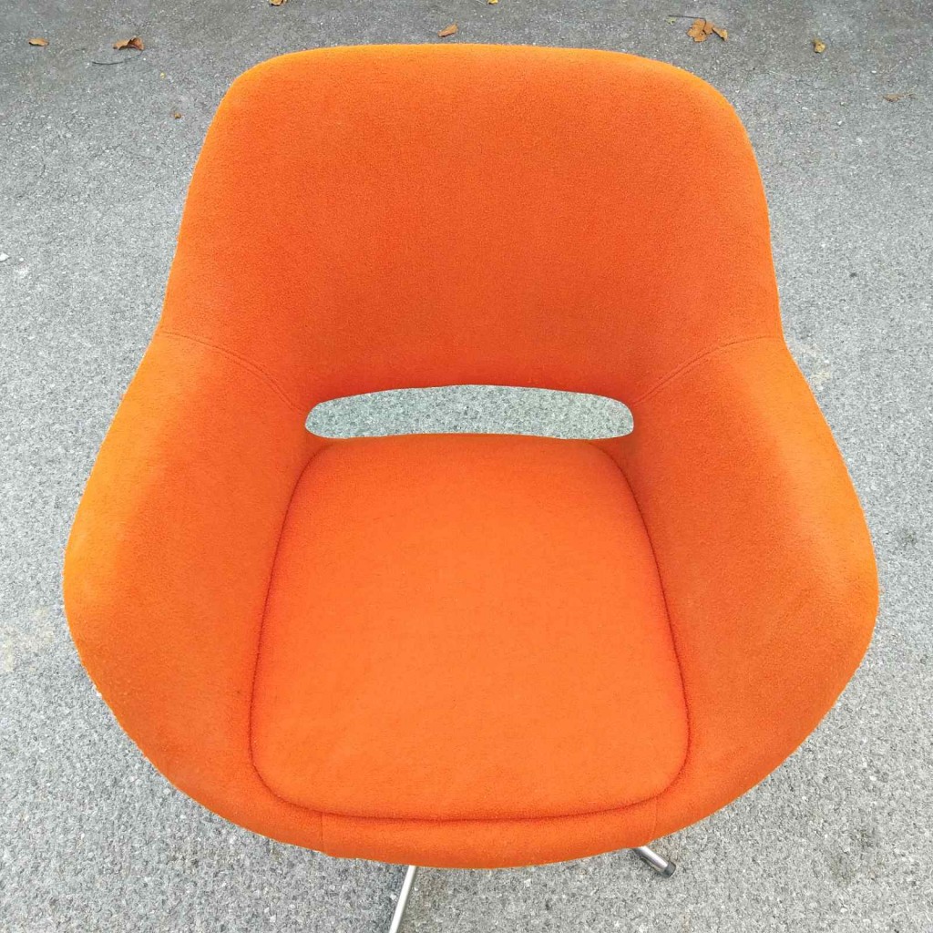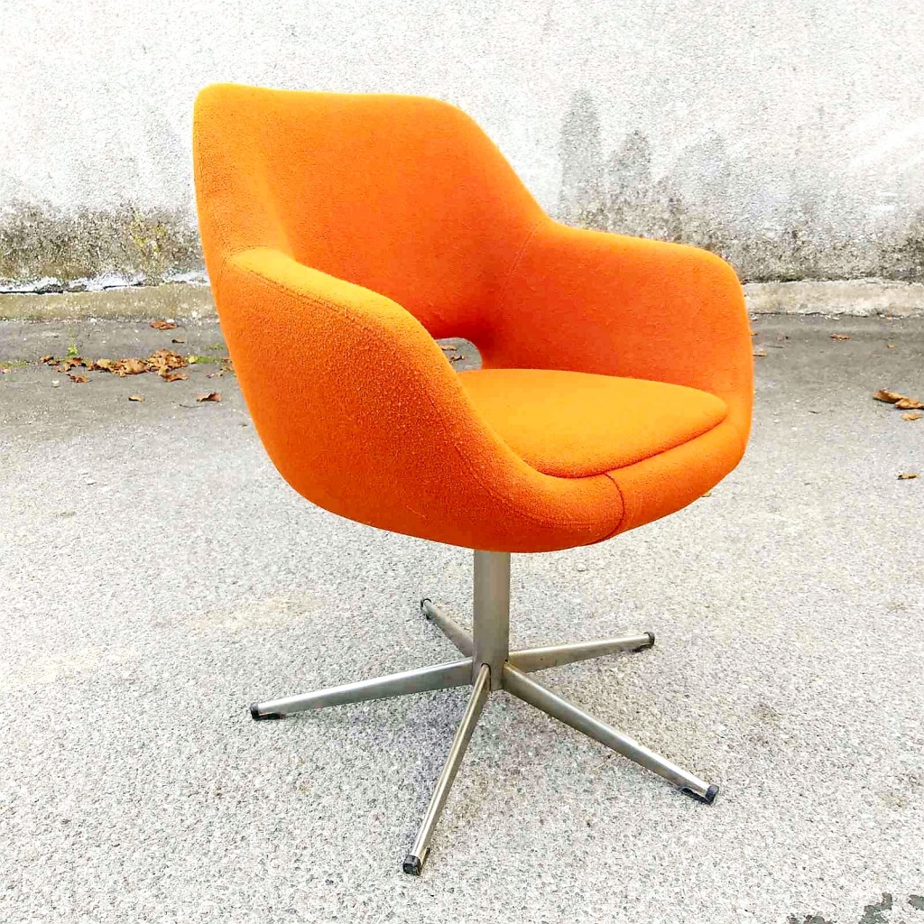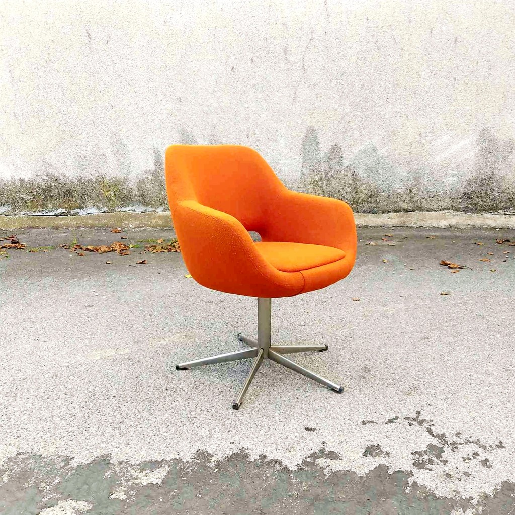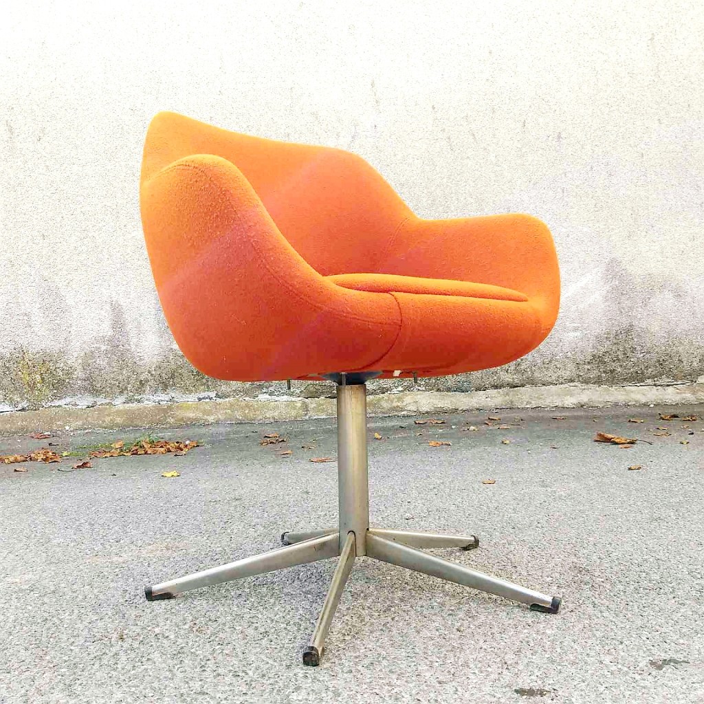 A sculptural soft ergonomic shape with a structure of a strong foam inner shell underneath the upholstery. Star-shaped chrome revolving base. An easy chair with armrests for your home or office. It kind of reminds us of the Arne Jacobsen's Egg chair.